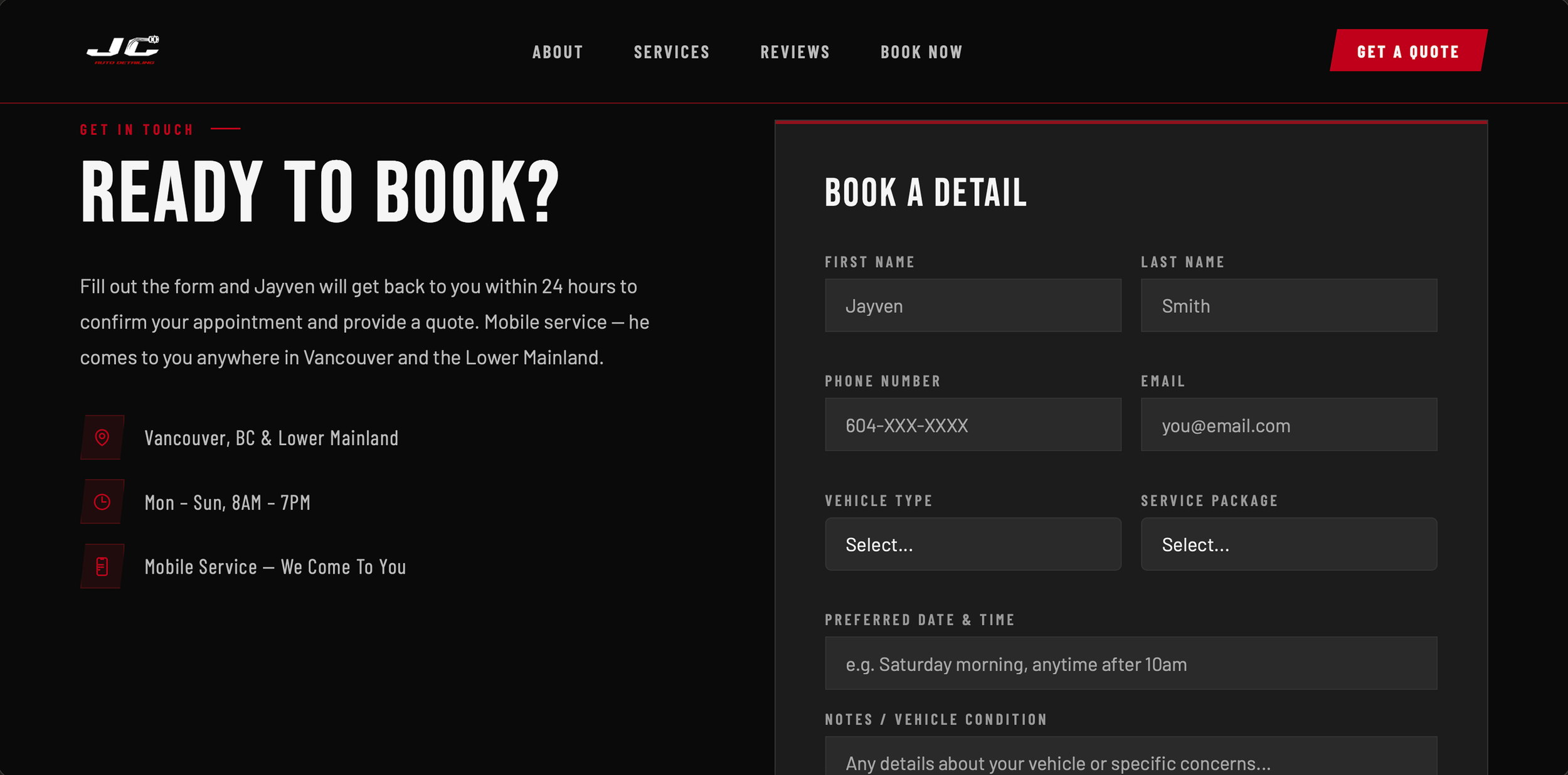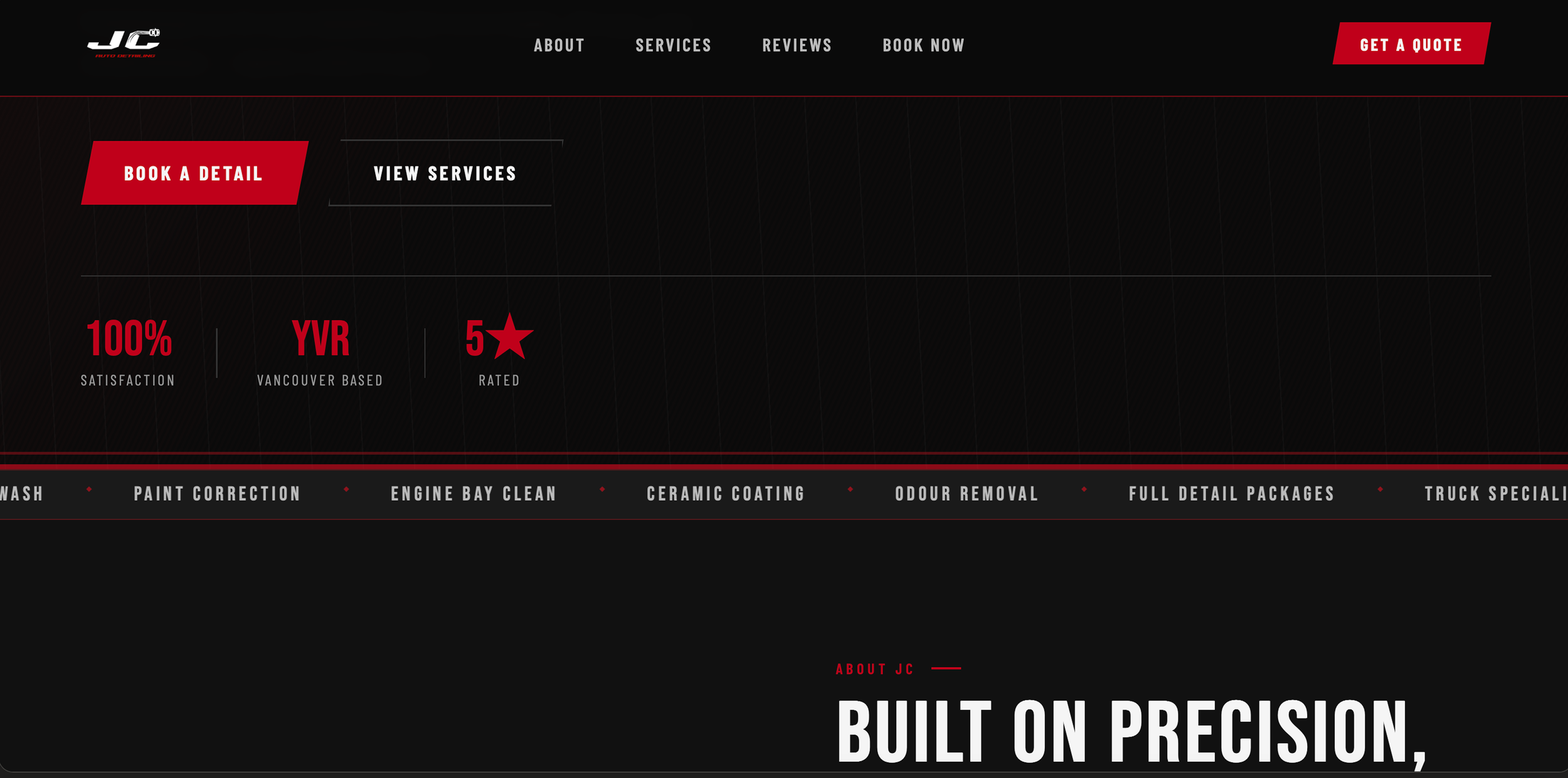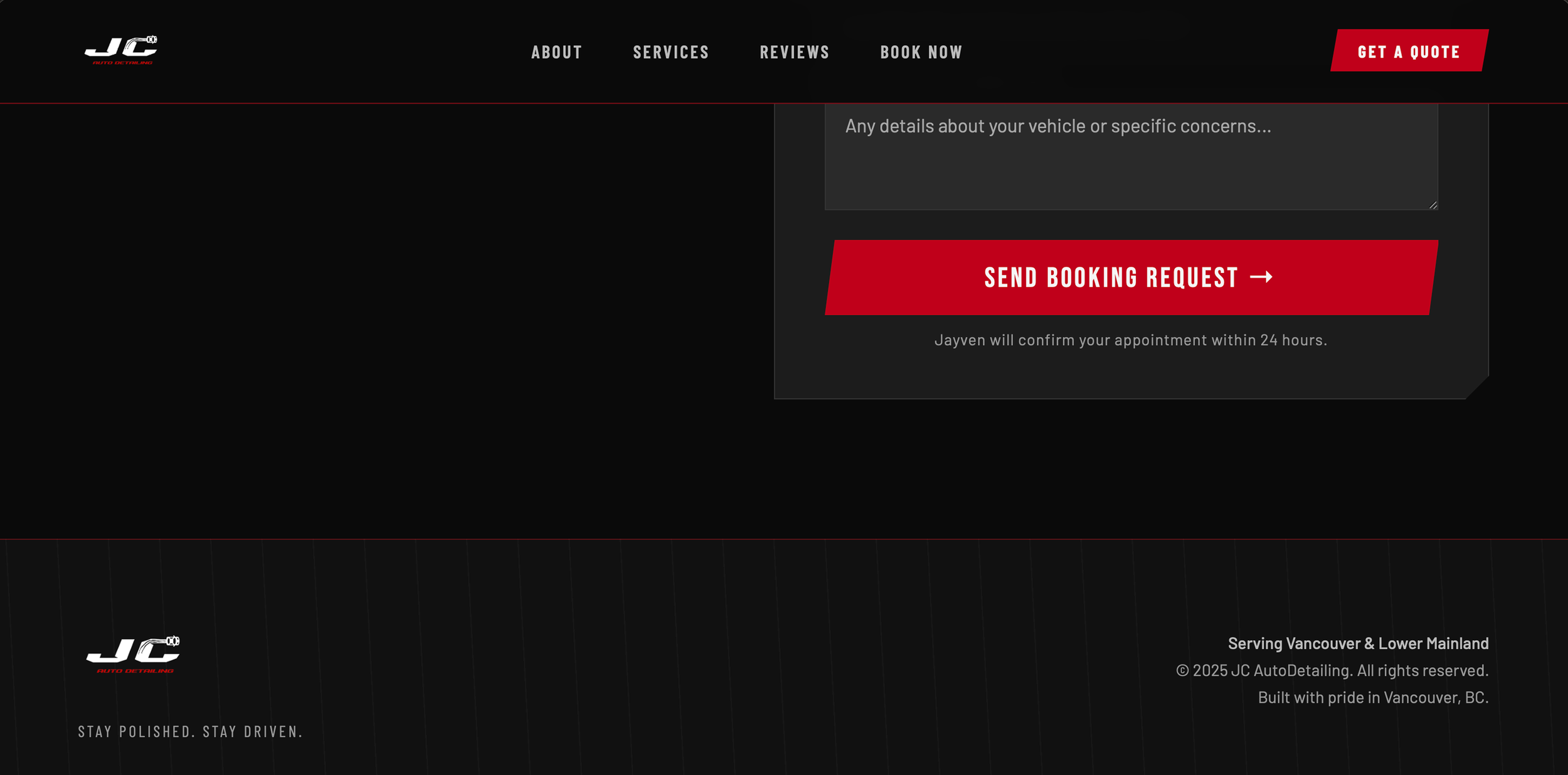 The new UX/UI design establishes JC Auto Detailing’s online presence, giving customers a seamless way to explore services and book directly through the website or mobile. Focused on clarity, accessibility, and ease of use, the redesigned experience simplifies the booking process while reflecting the brand’s professional and high-performance identity. By creating a consistent digital foundation, JC Auto Detailing can now better connect with customers and grow its online engagement.
