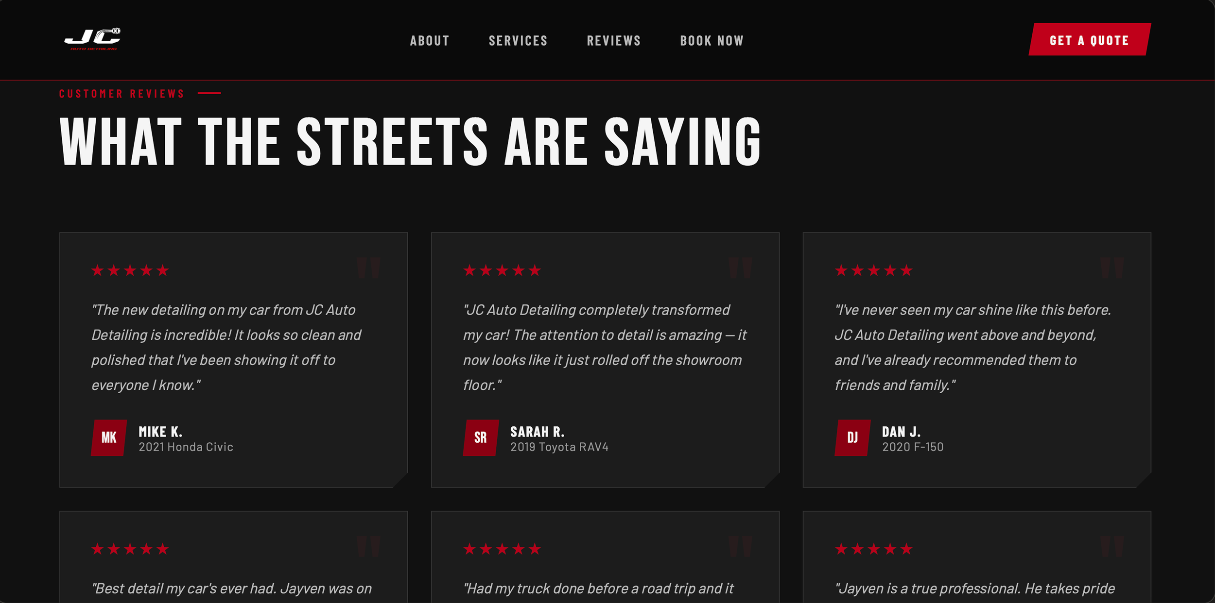 “I’ve never seen my car shine like this before. JC Auto Detailing went above and beyond, and I recommended them to friends and family!”