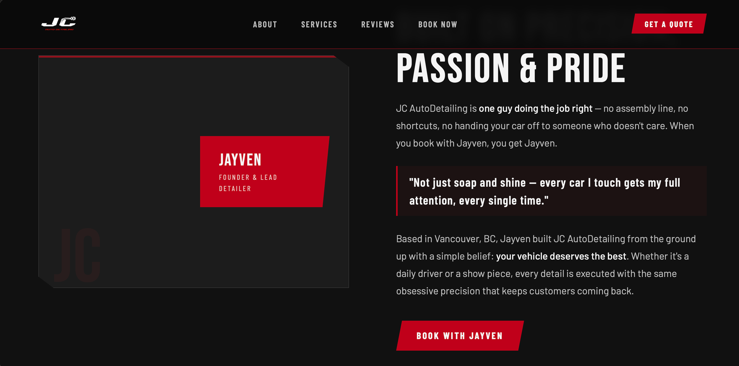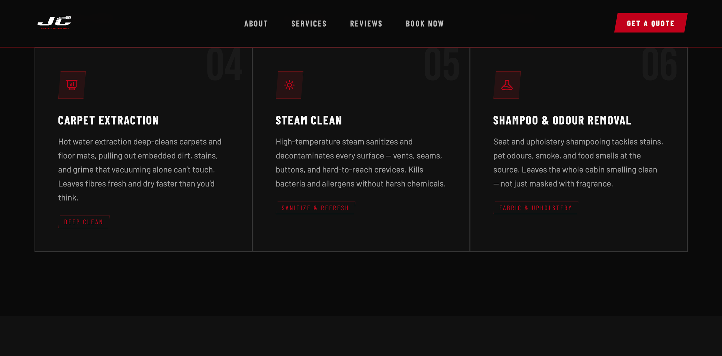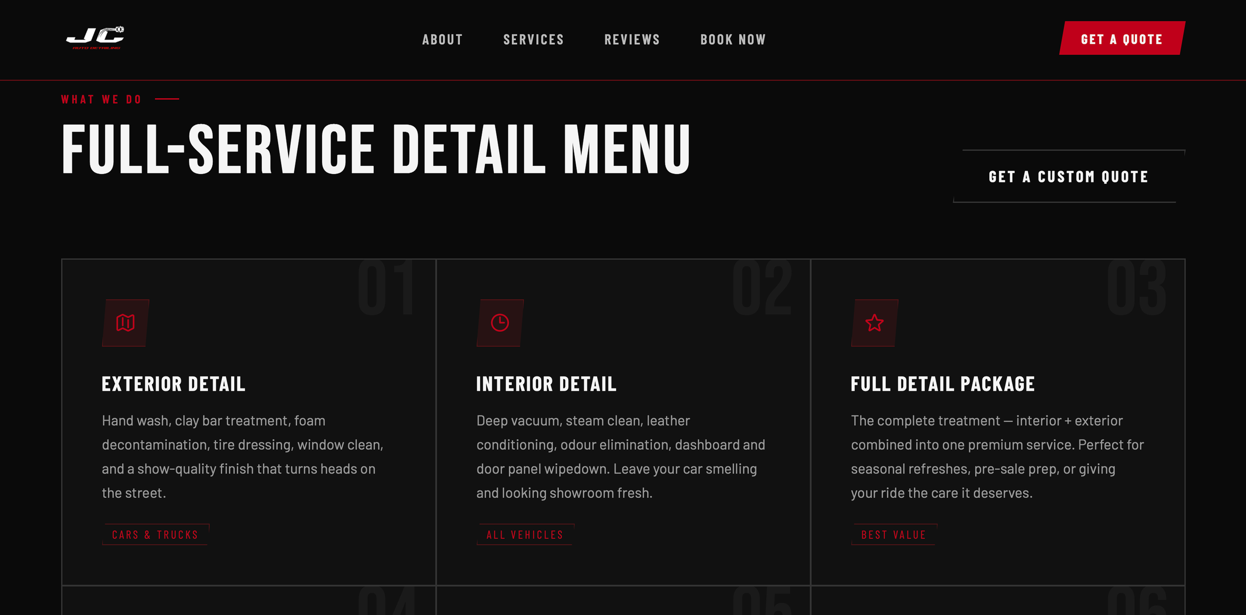 From there, I built out the full visual identity, including a font guide and a fresh colour palette of deep red, black, white, and dark grey to convey a sleek, high-performance feel. The new branding now embodies the confidence and professionalism that define JC AutoDetailing.