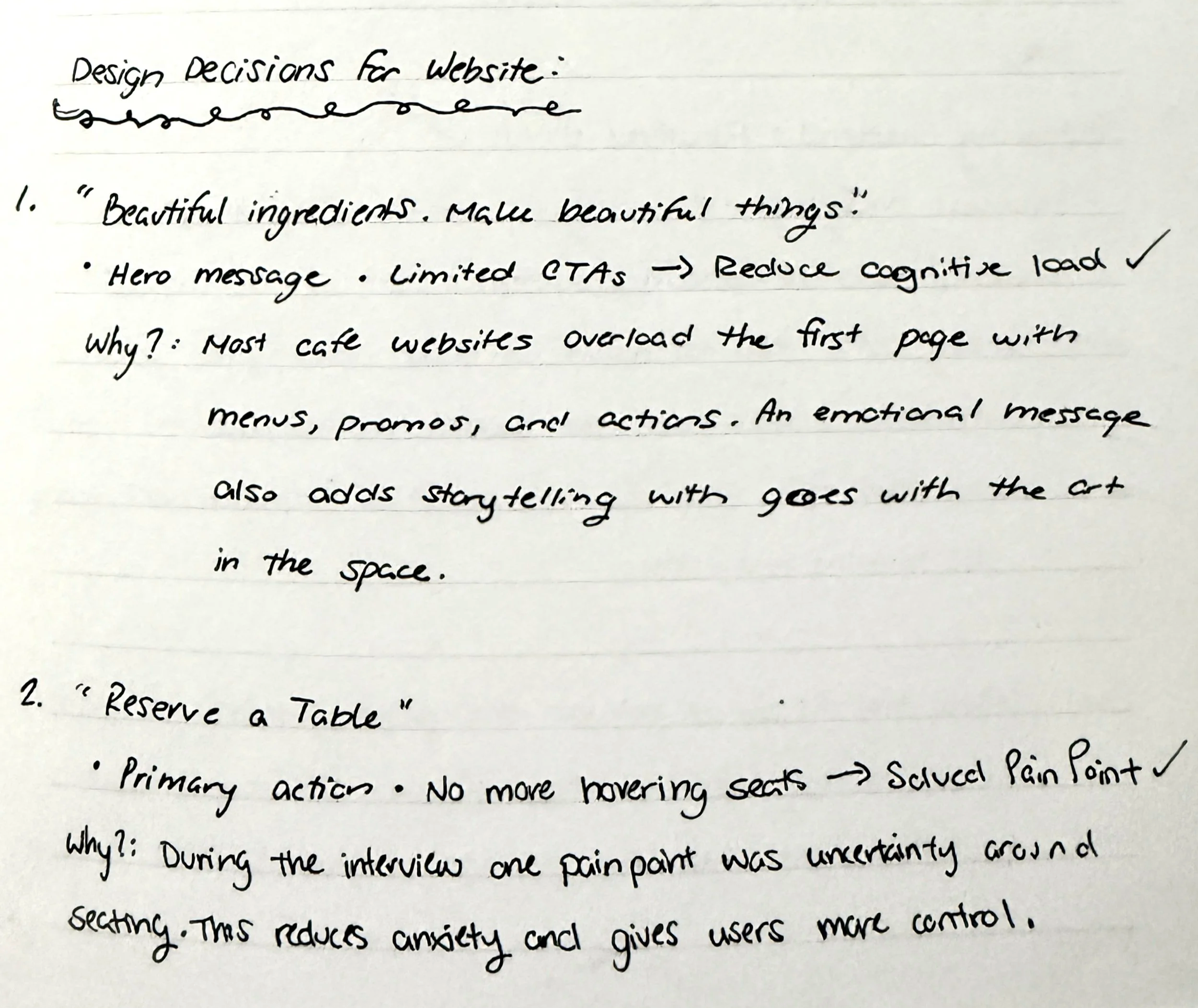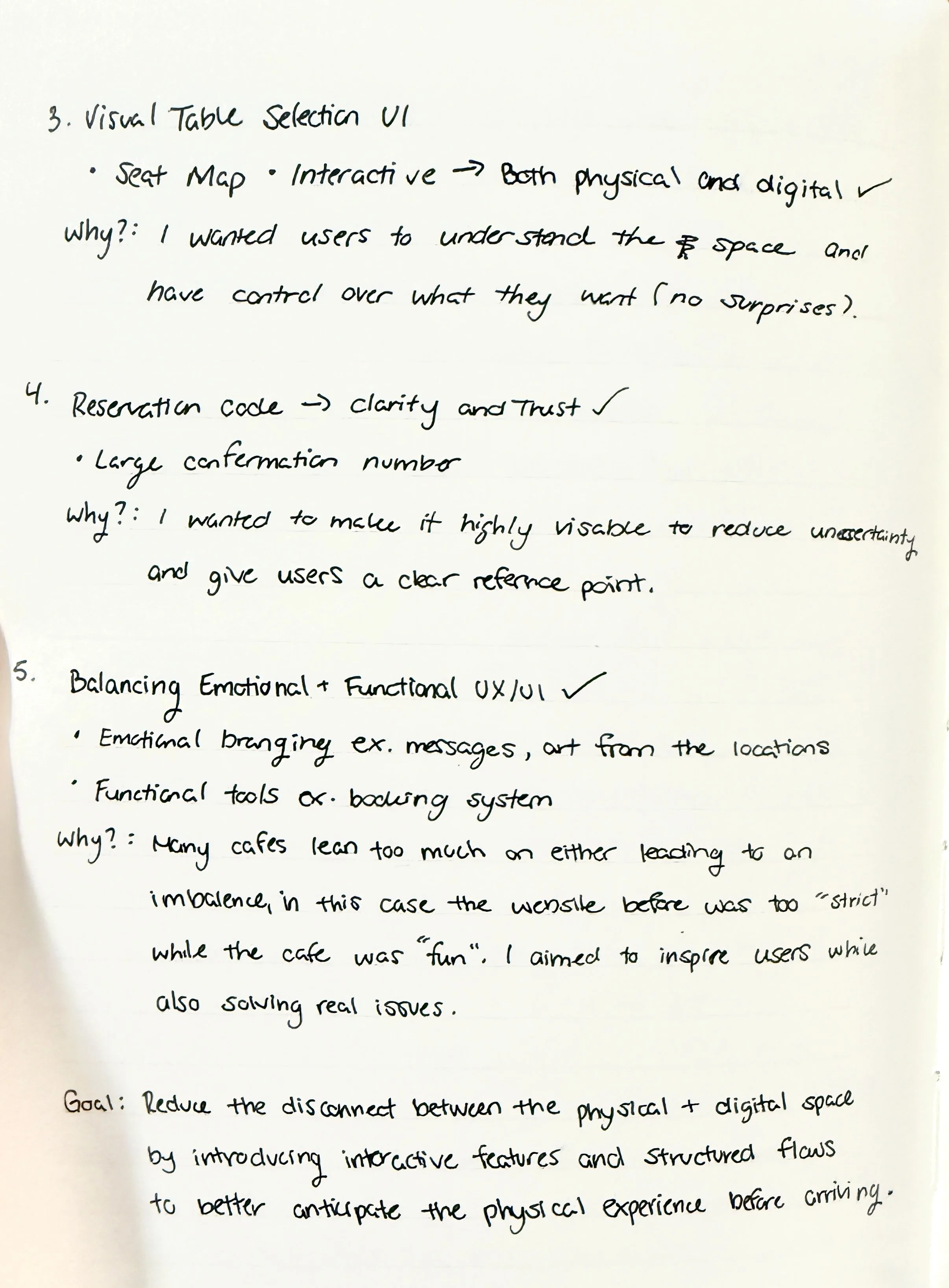 I designed the experience to balance clarity, functionality, and brand expression. Based on research around in-store friction, especially around seating and uncertainty, I prioritized a streamlined reservation flow with a visual table selection system to better connect the digital experience to the physical space. The layout is intentionally minimal and structured to reduce cognitive load while reflecting the café’s sense of craftsmanship. At the same time, I incorporated moments of exploration and brand storytelling so the site not only functions well but also captures the atmosphere and intent behind the café.