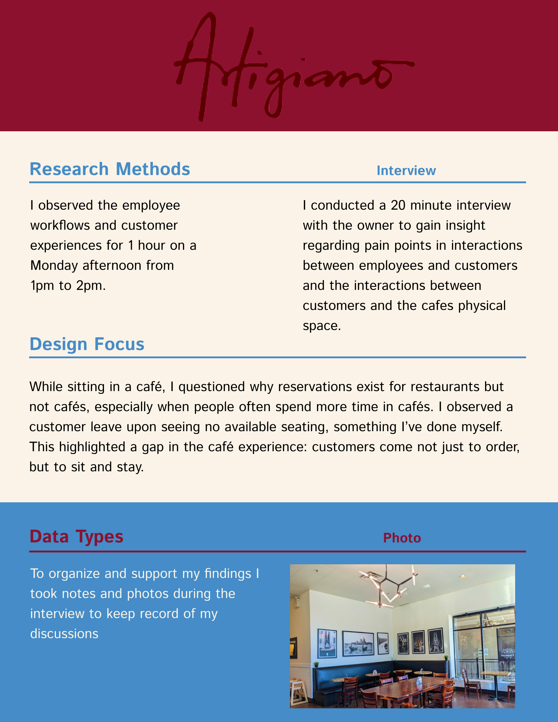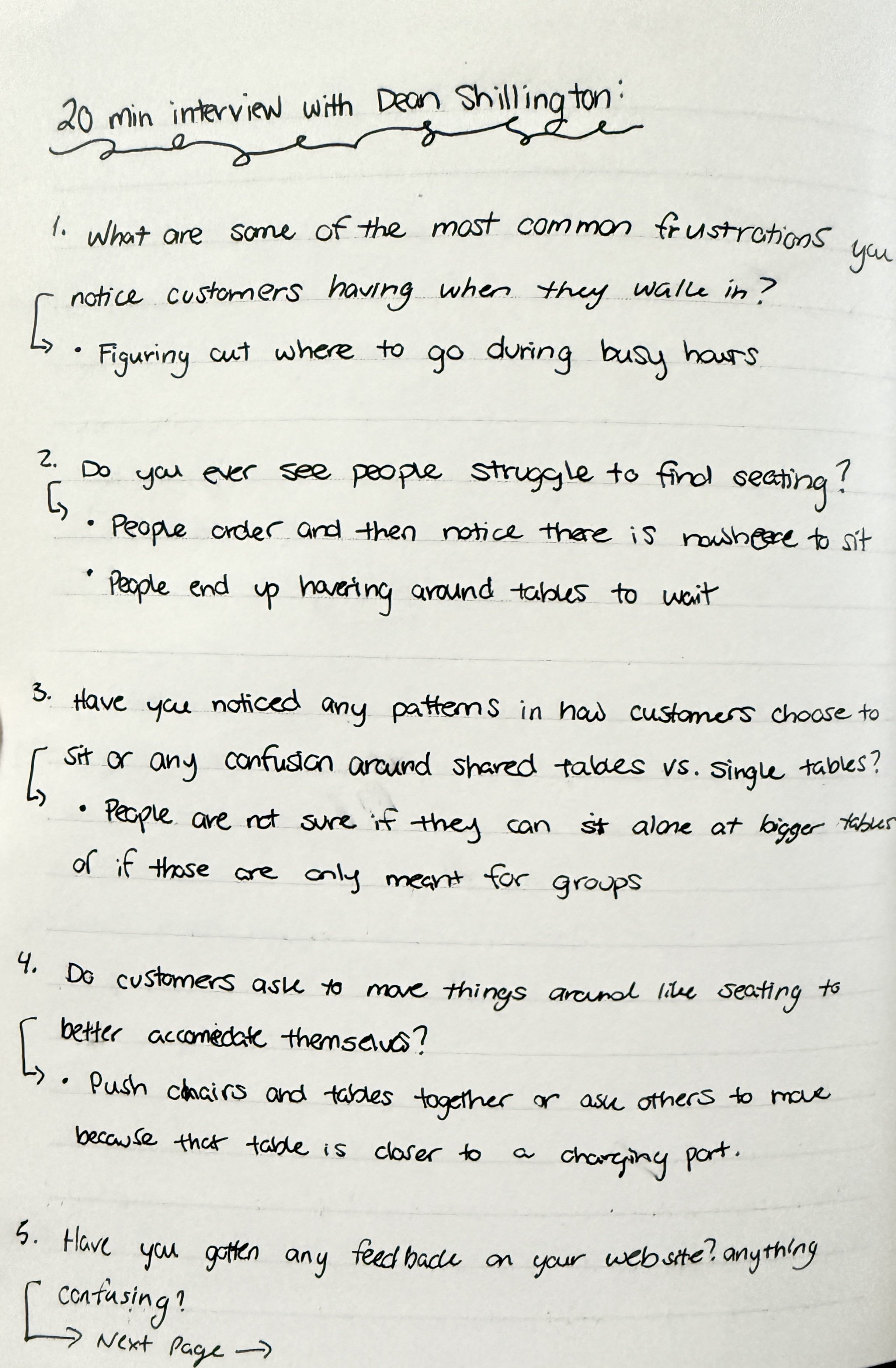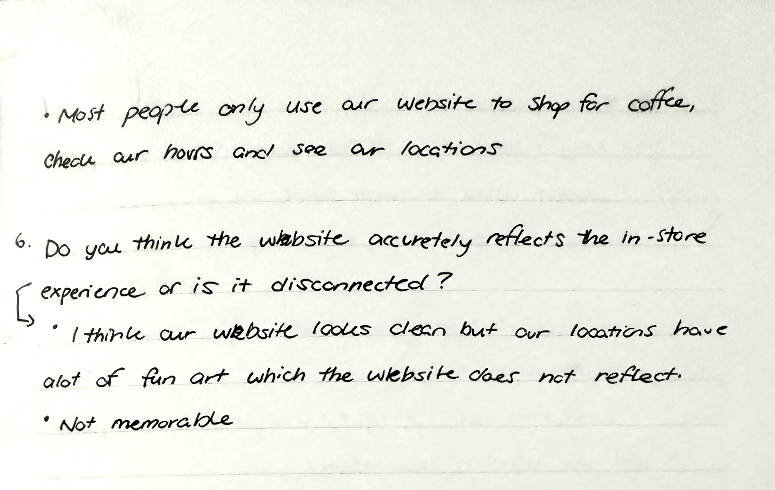 To better understand the users of the café, I visited Artigiano Café in Burnaby and spoke directly with the owner to gain insights into customer and employee interactions. I also talked with a few customers and observed both employee workflows and guest experiences to get a full picture of how the café operates.