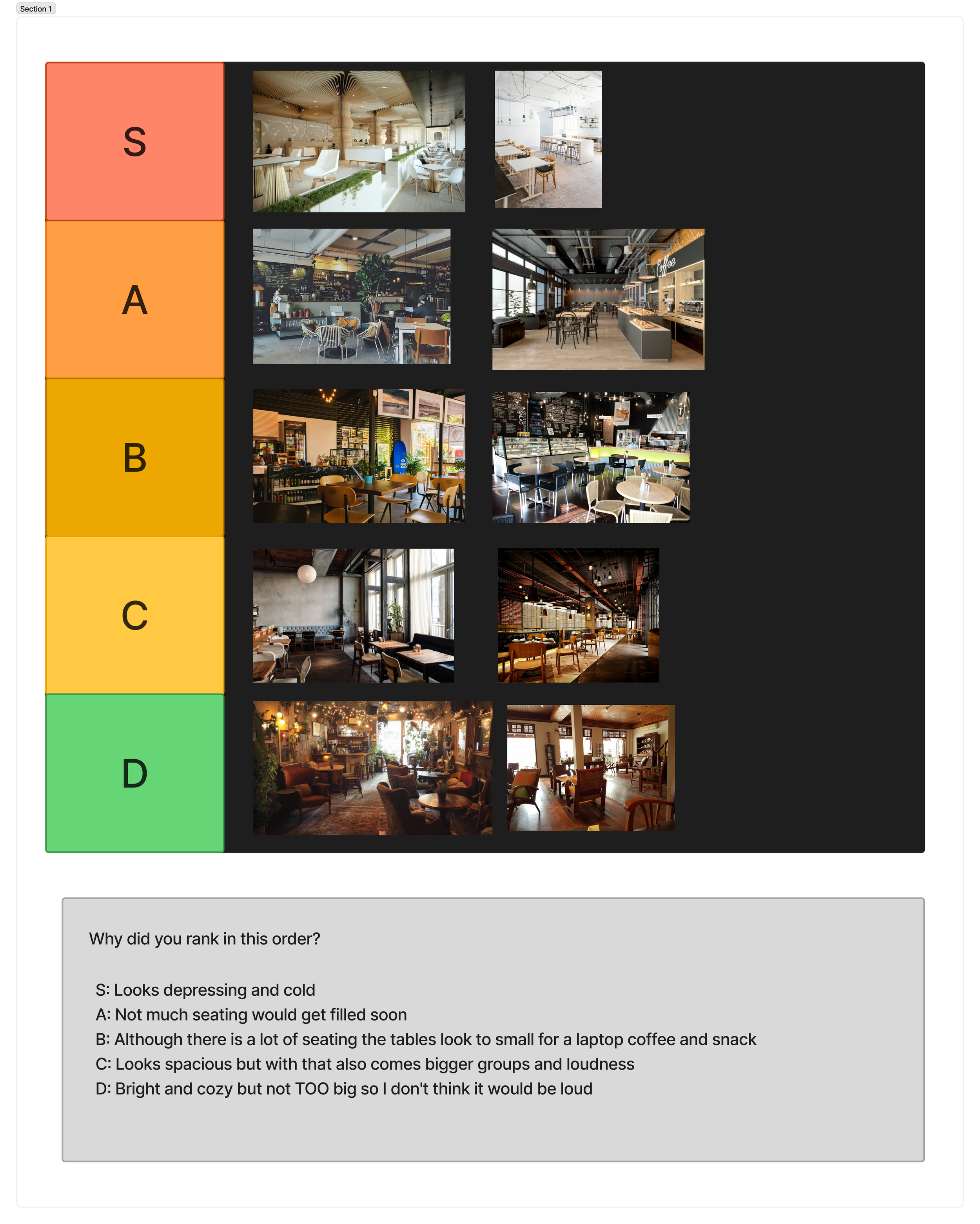 Participants were asked to rank various study space images to better understand their priorities. Rankings ranged from D (best) to S (worst), and participants provided explanations below the tier list to support their choices.