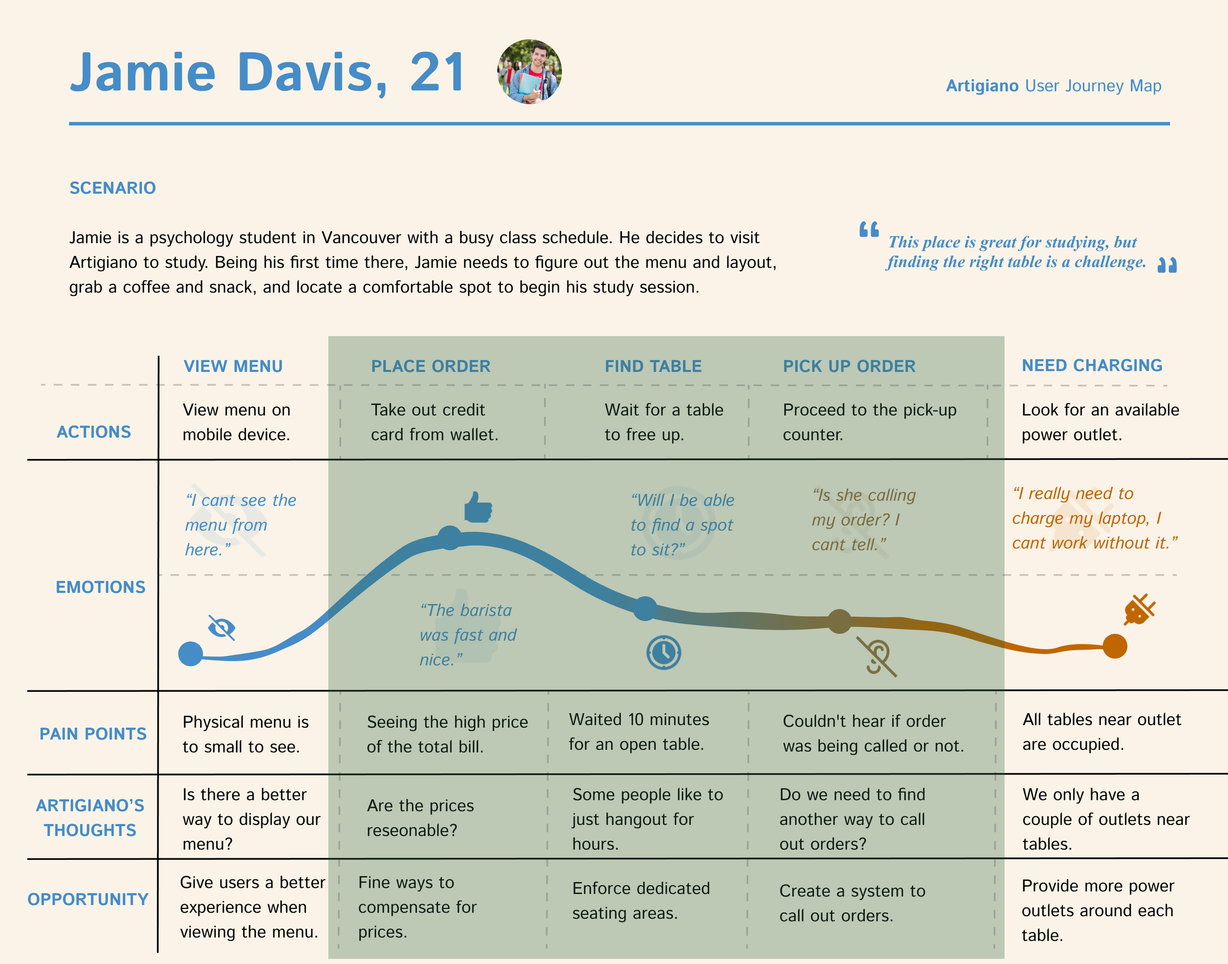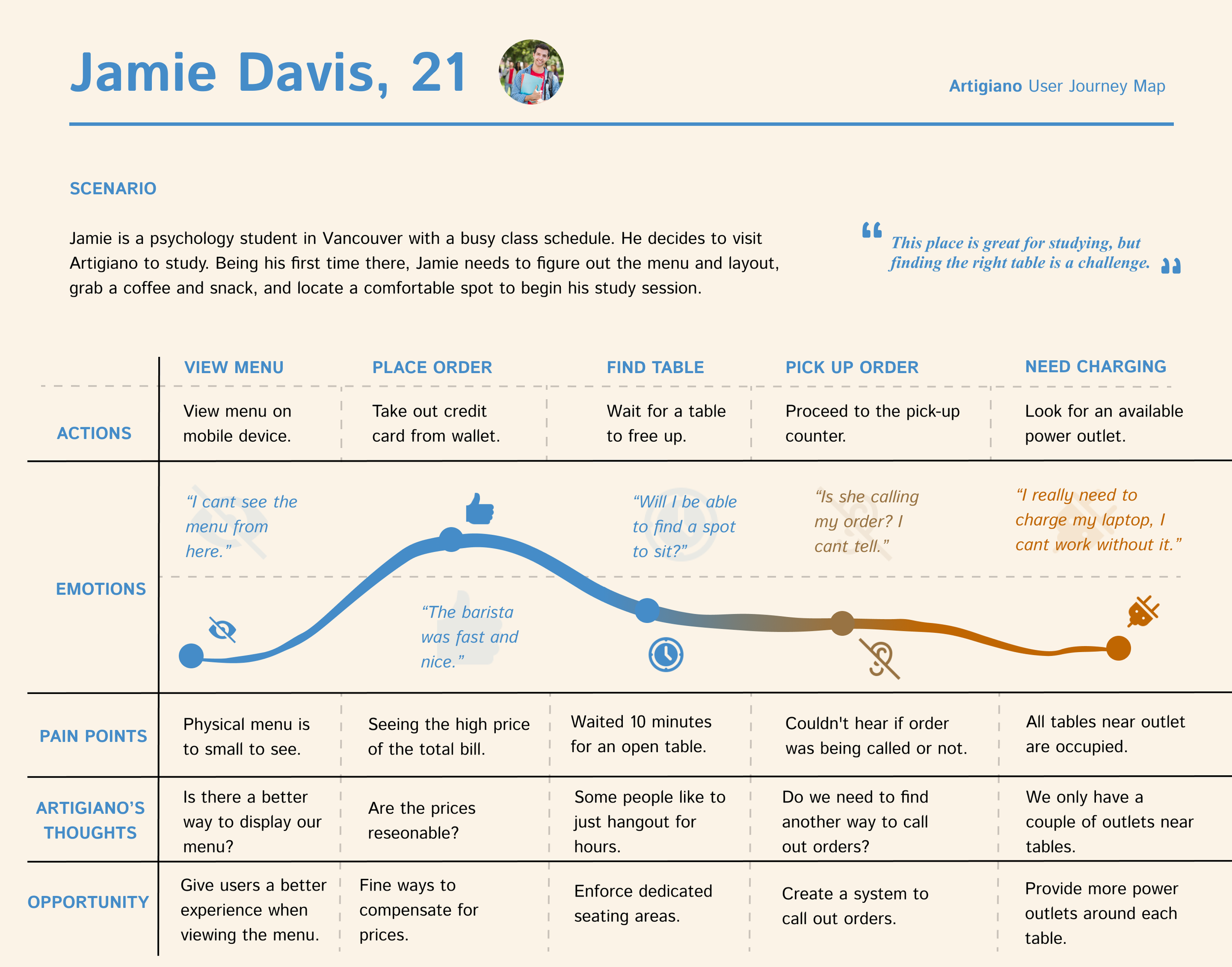This user journey map illustrates Jamie’s typical visits to Artigiano. It reveals the challenges he faces at each step and highlights opportunities to enhance his study experience and make his routine smoother.
